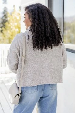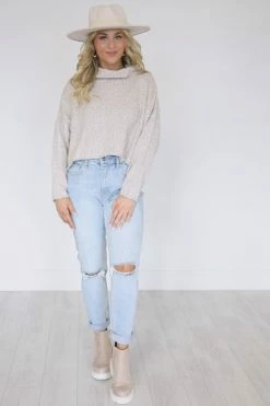 - Cowl neckline with long sleeves, rolled hem, and cropped length