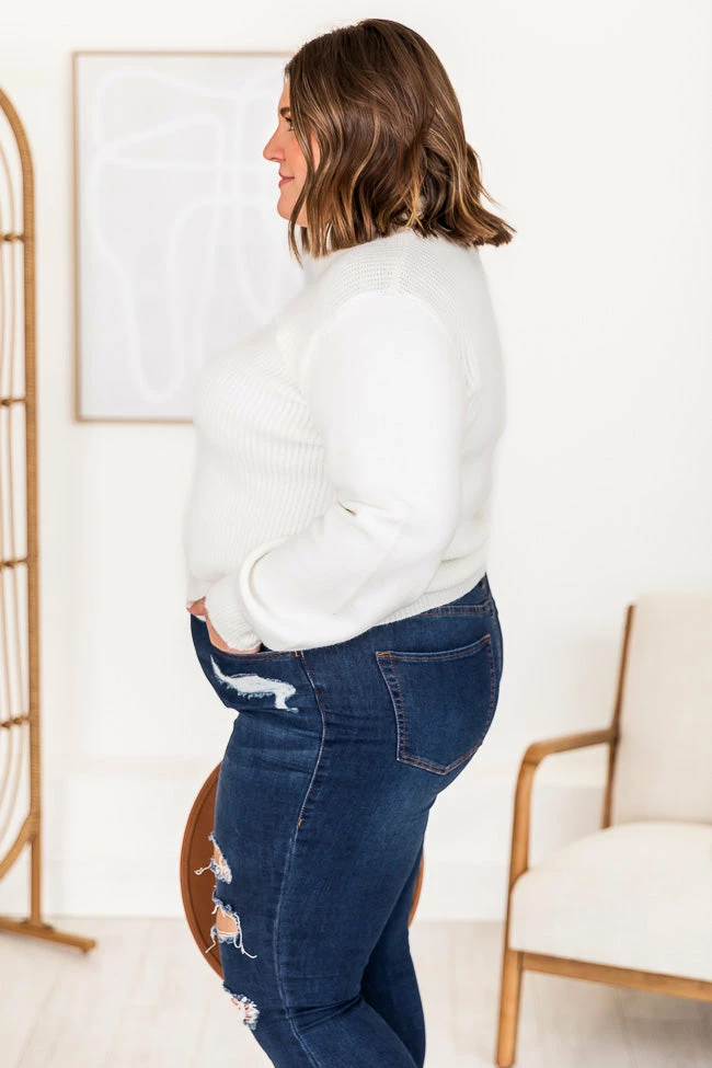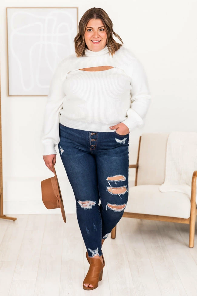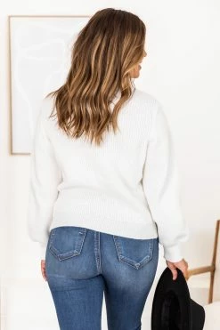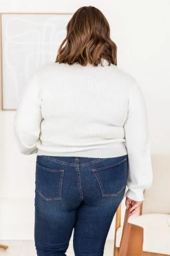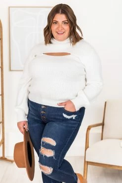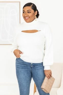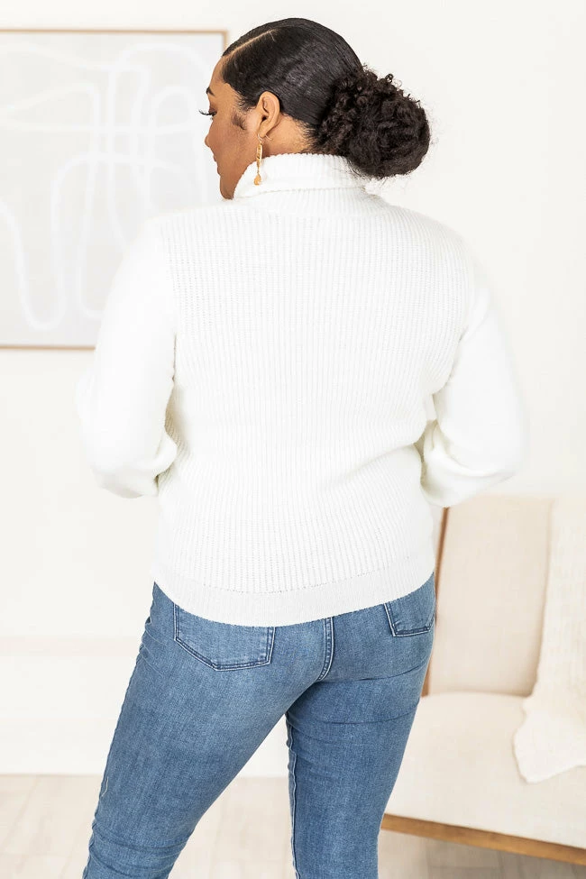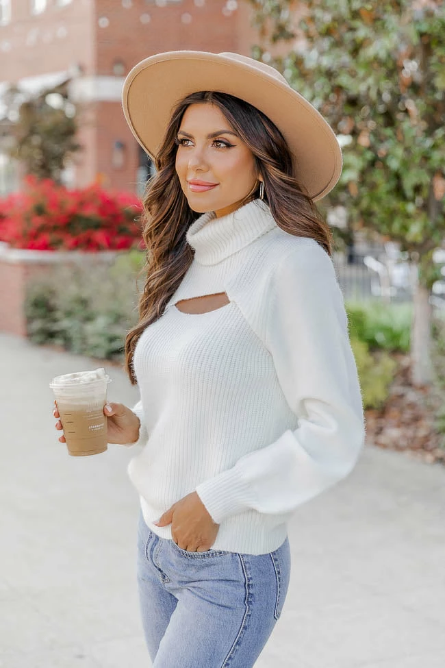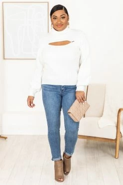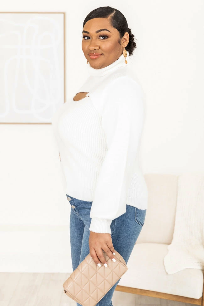 - Turtleneck style with keyhole cut across bust and long sleeves