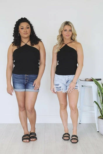 - Halter neckline and tank straps