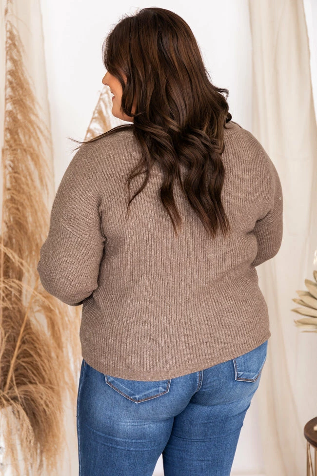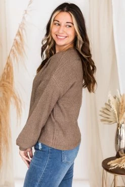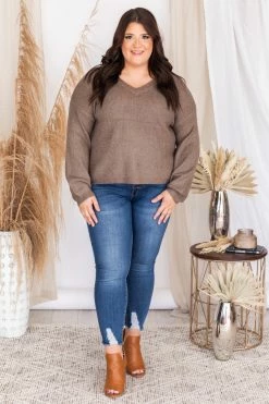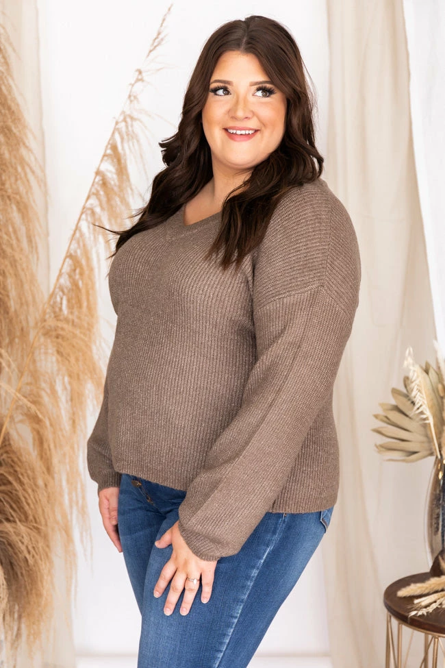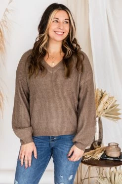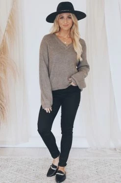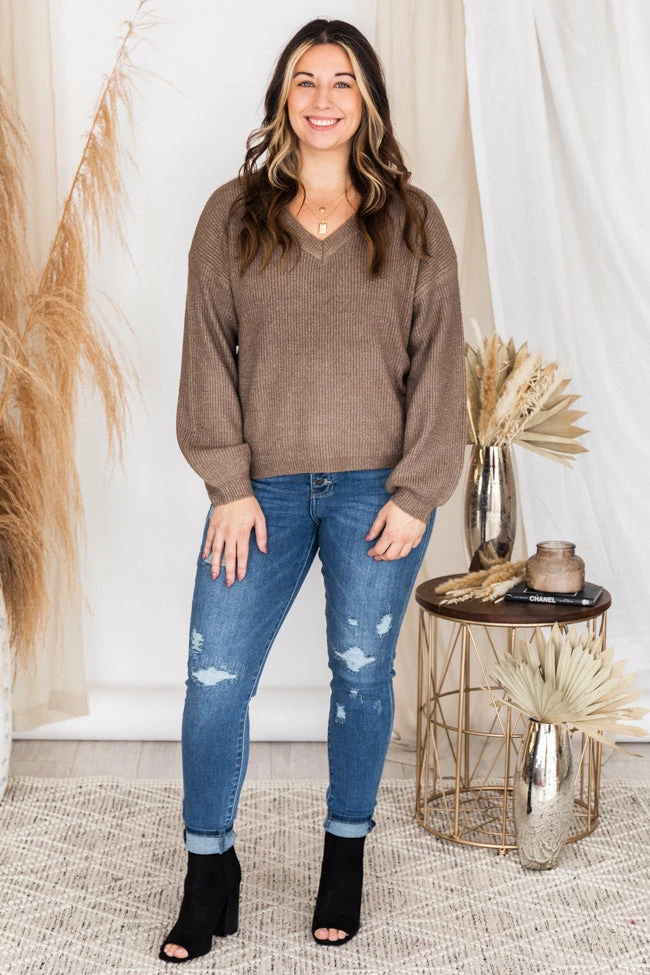This cute brown V-neck sweater is a must have basic in your closet for this season. We love the soft knit fabric and fun neutral color with balloon it’s so adorable. This will be your new fav all season long. Pair this sweater with leggings or jeans for the perfect ‘fit!