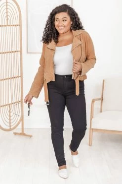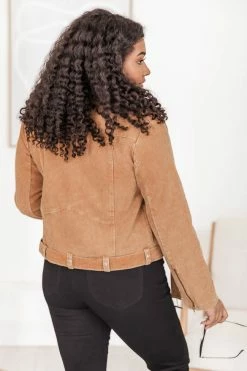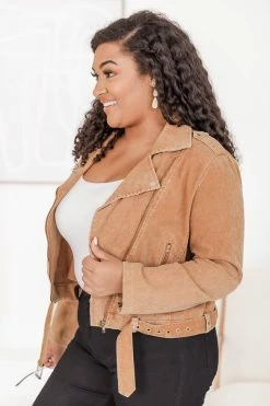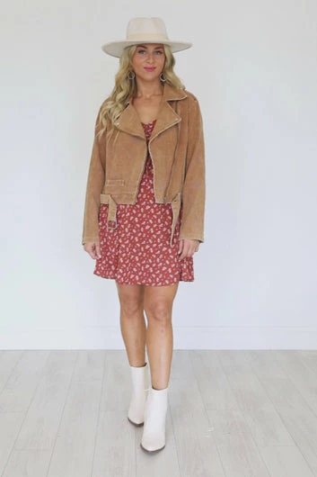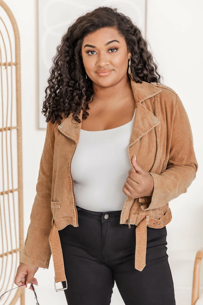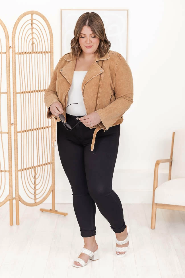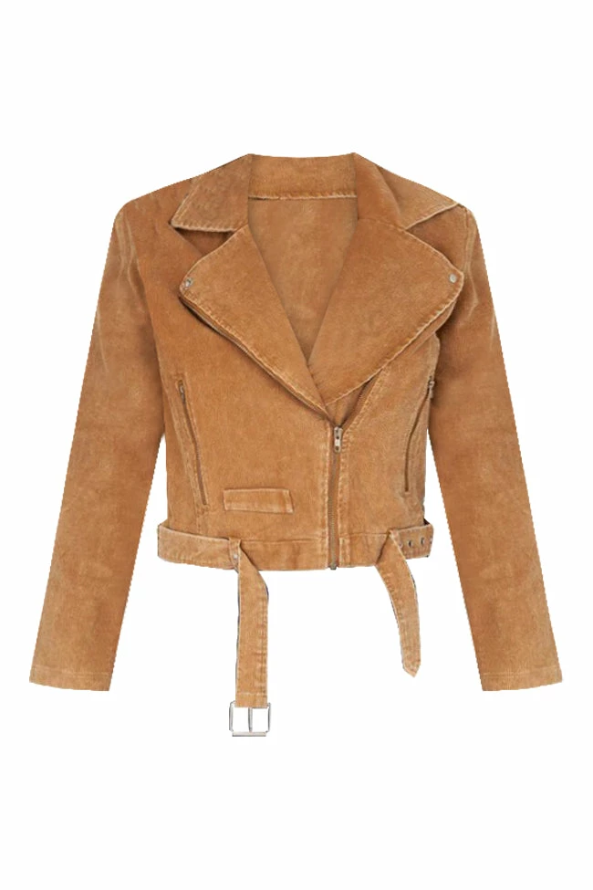 - Moto style with long sleeves, cropped length, zipper closure and functional pockets