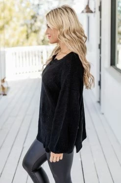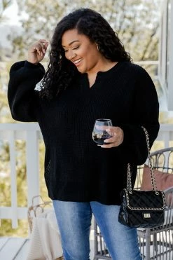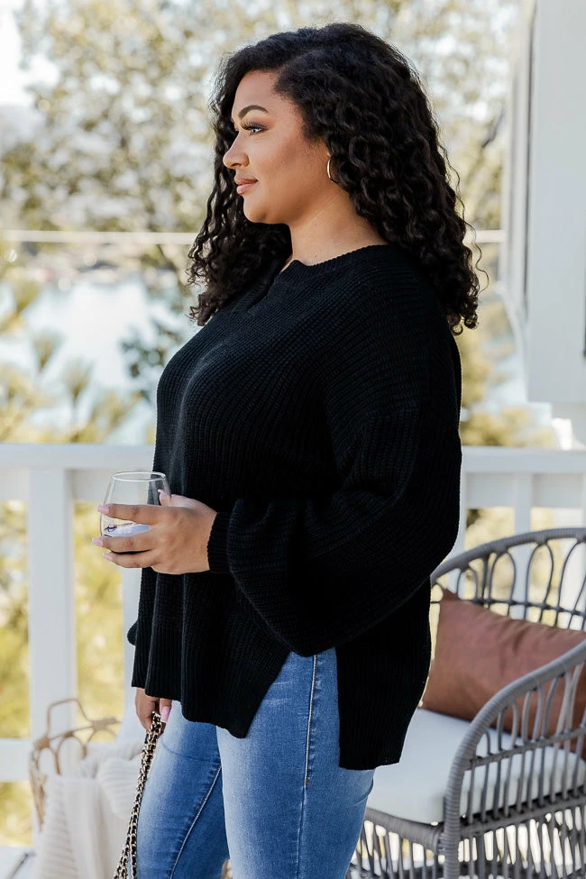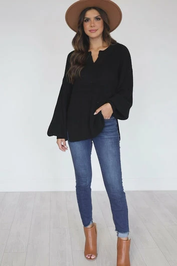 - Notched neckline with long balloon style sleeves, side slits, and ribbed hem detailing