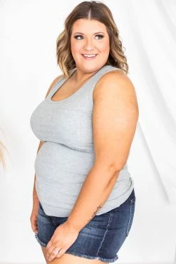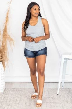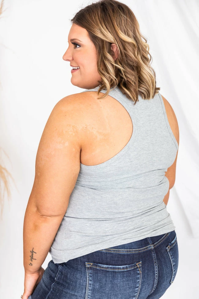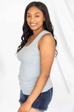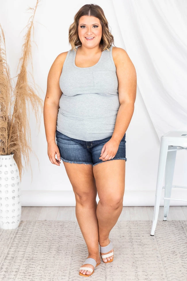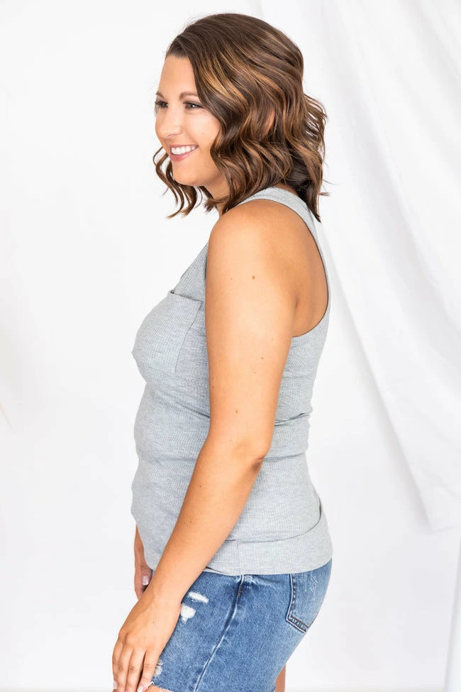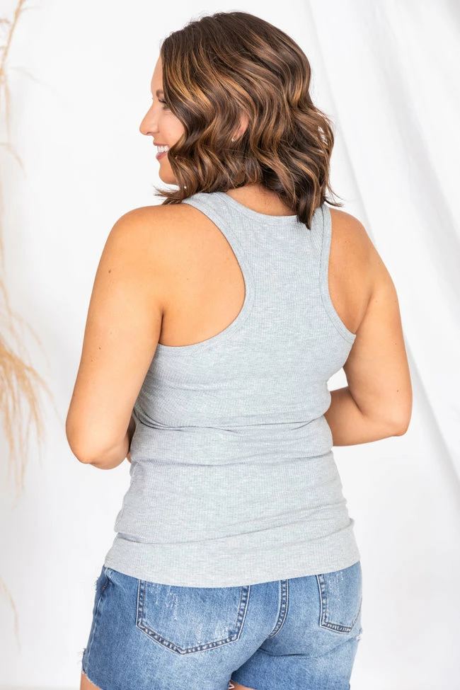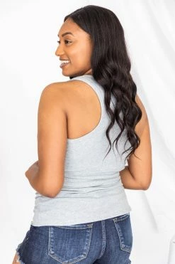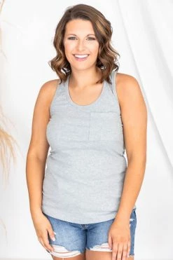 This top is so simple and a need in your closet this summer. We love the light grey color and stylish ribbed fabric for a great combo. This top also features a racerback style, pocket detail, and tank cut. Just add shorts or jeans and sandals for a fun casual day look!