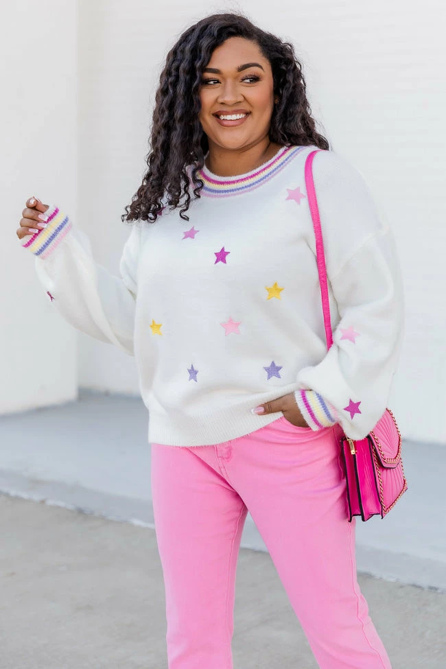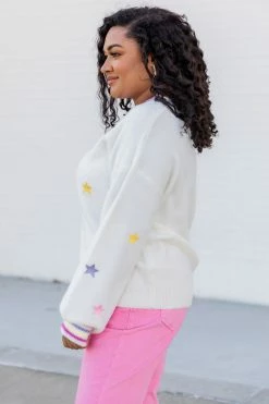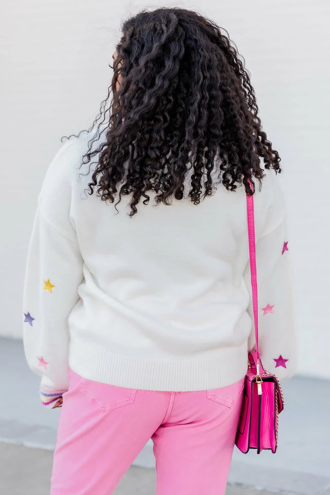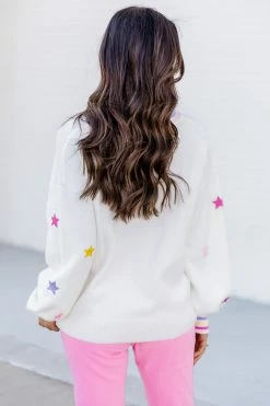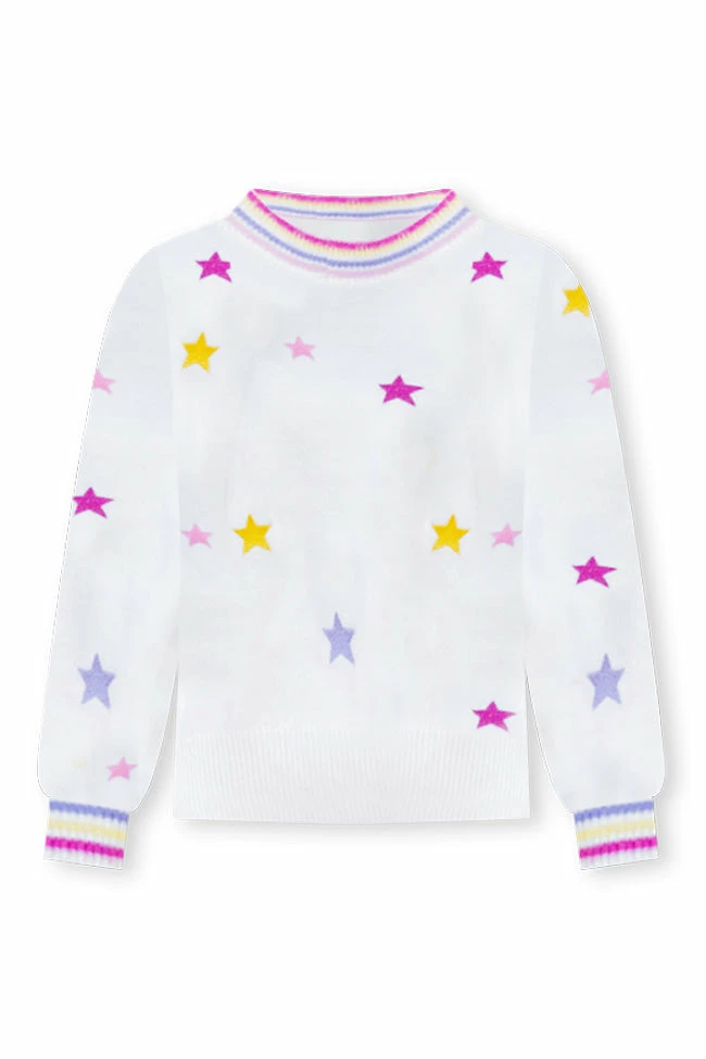 - Crew neckline with long sleeves, multicolor embroidered star detailing, and coordinating multicolor ribbed hem
