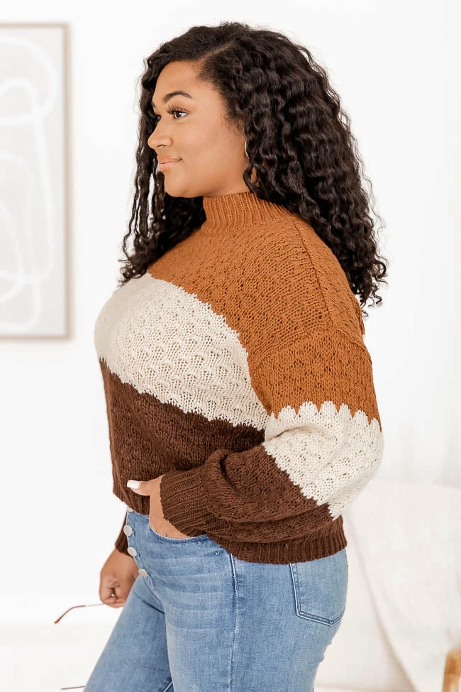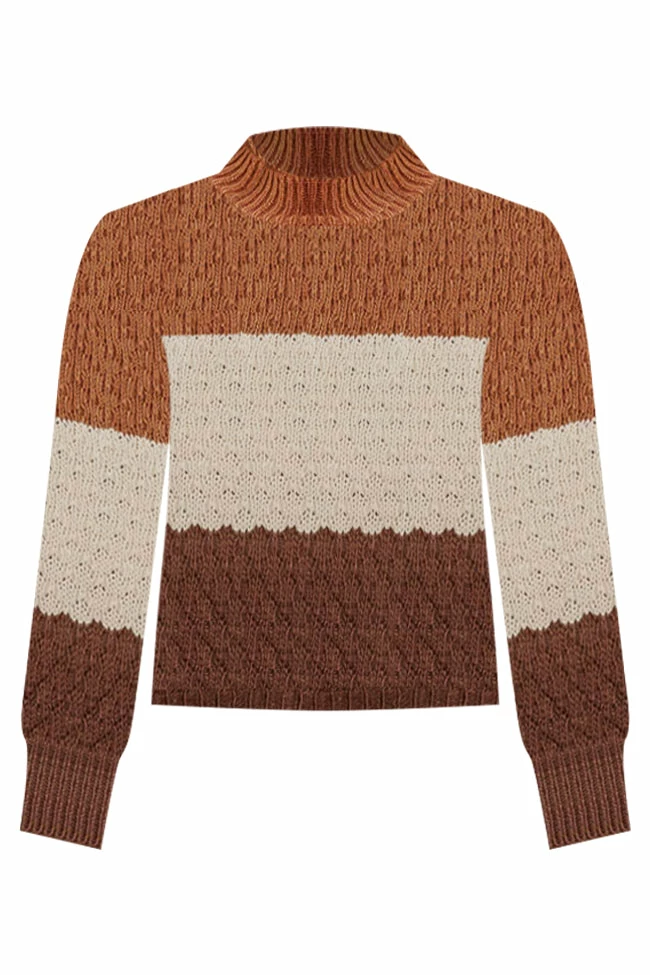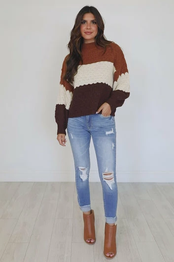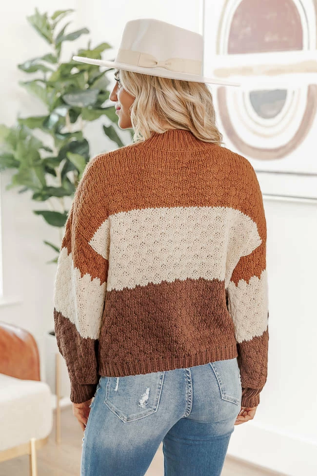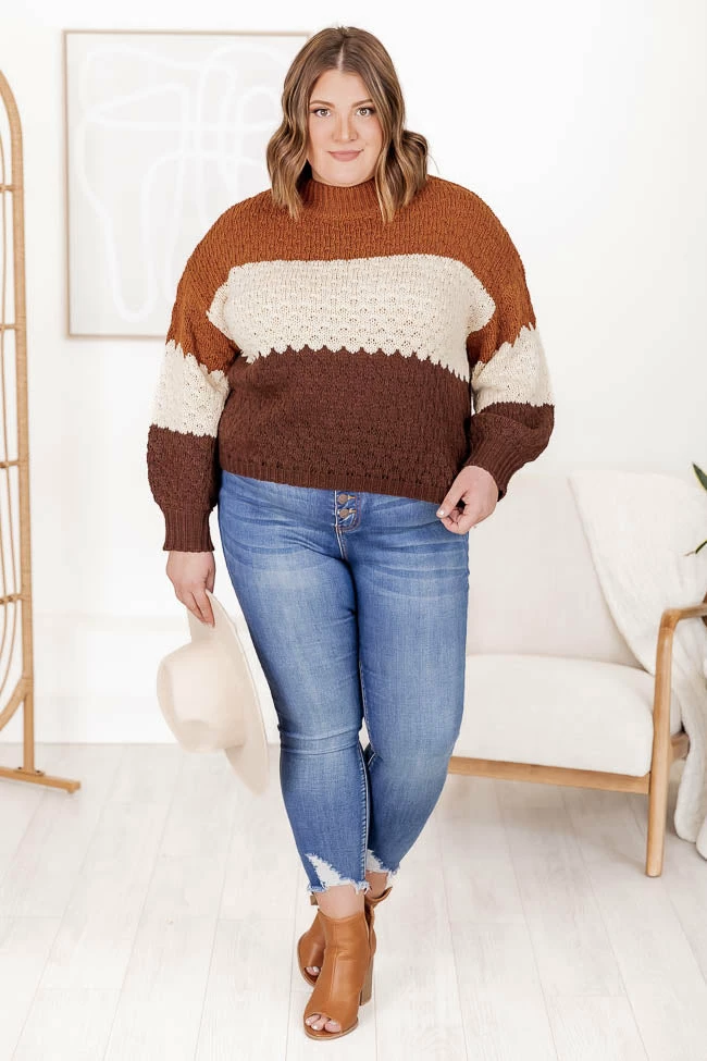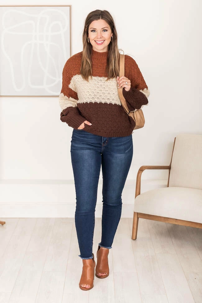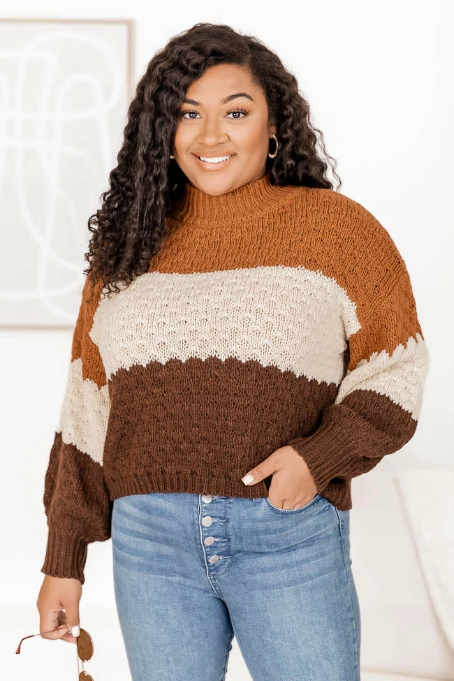 - Mock neckline with long balloon sleeves and ribbed hem and sleeve details with a slight cropped length