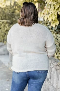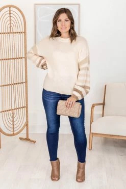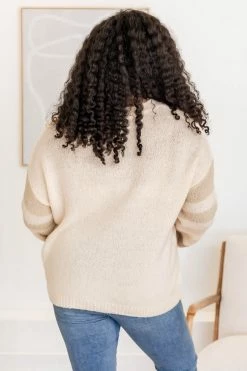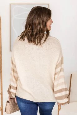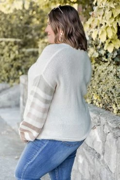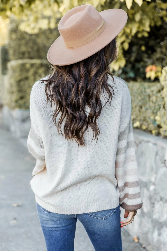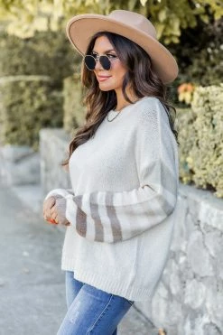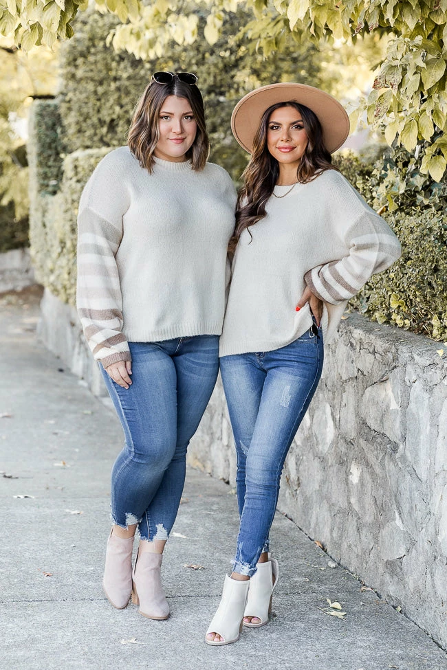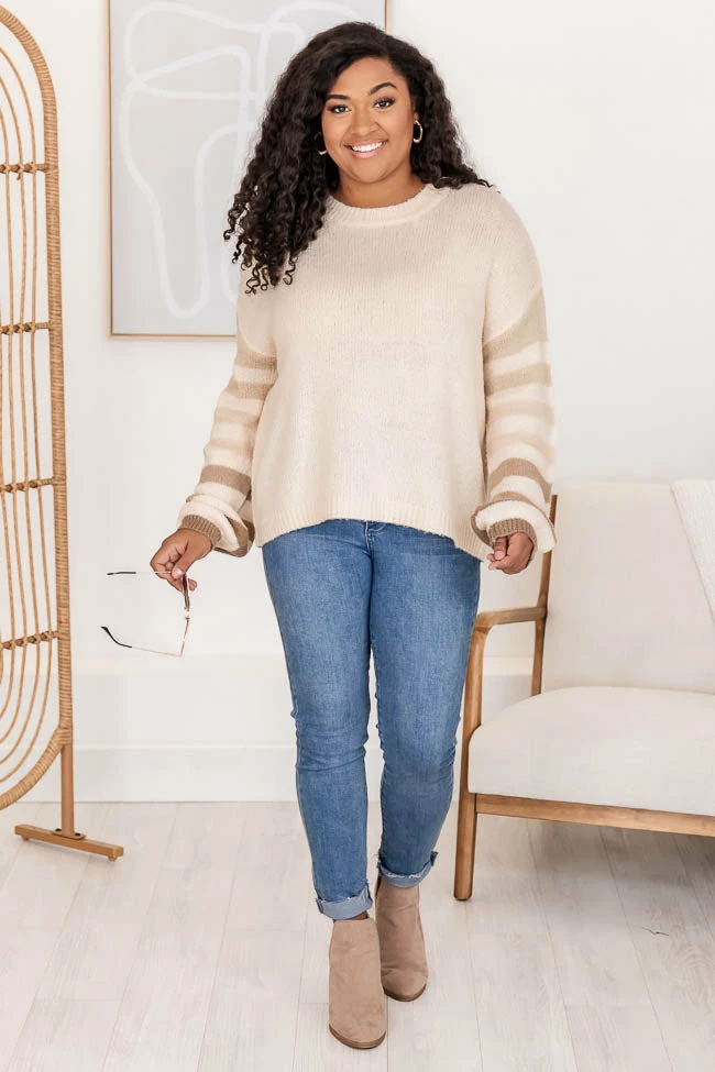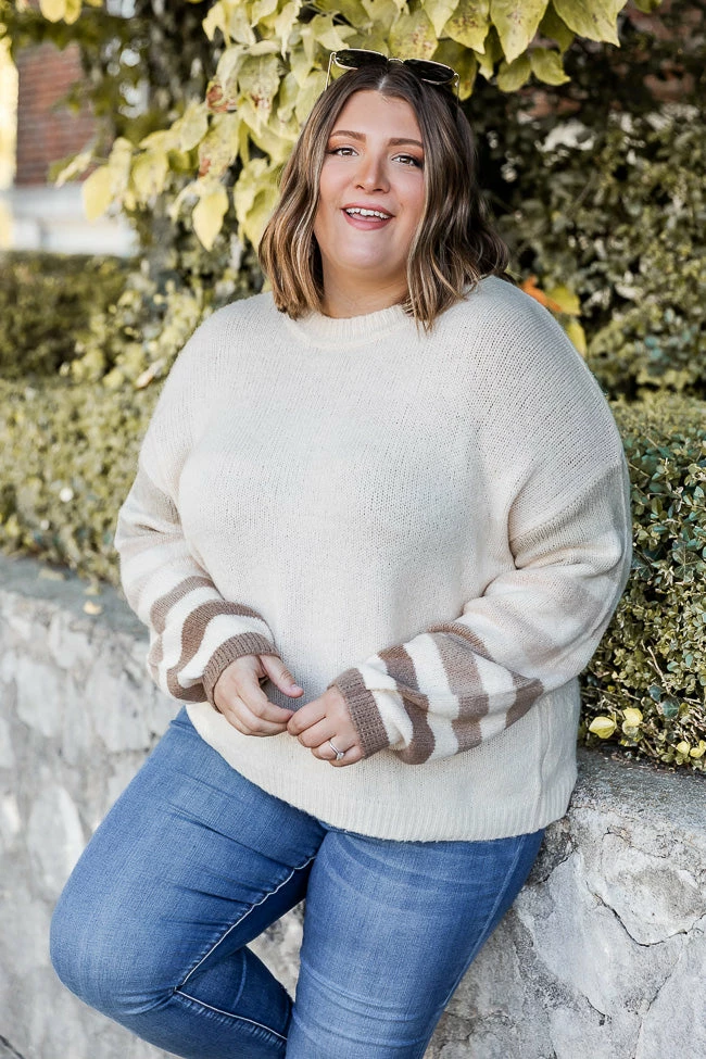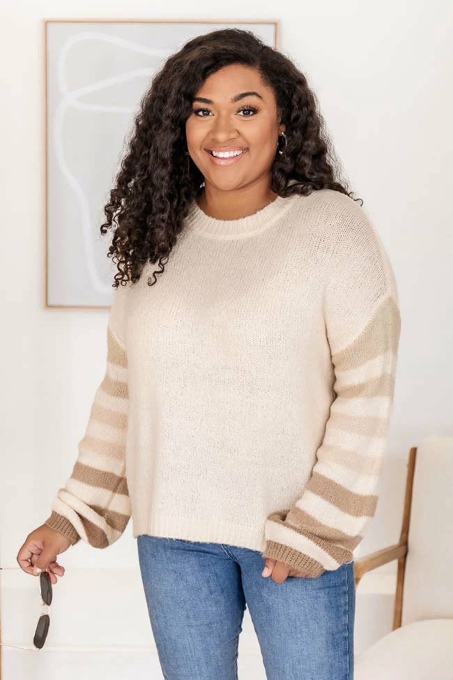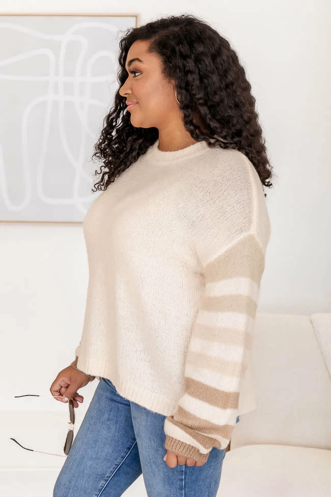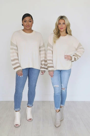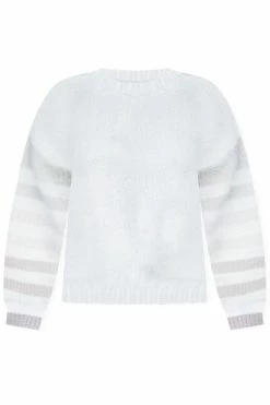 - Crew neckline with long balloon style sleeves, with striped detail and ribbed hem detailing