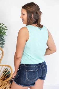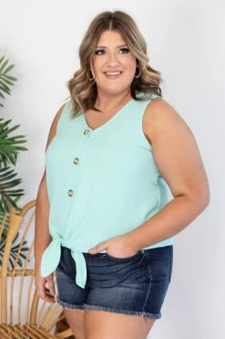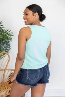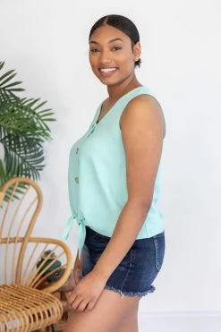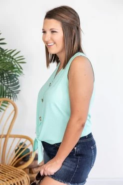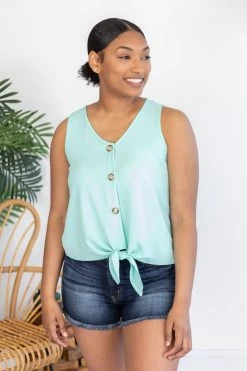 - Tie front hem with a fun button detail and tank cut
