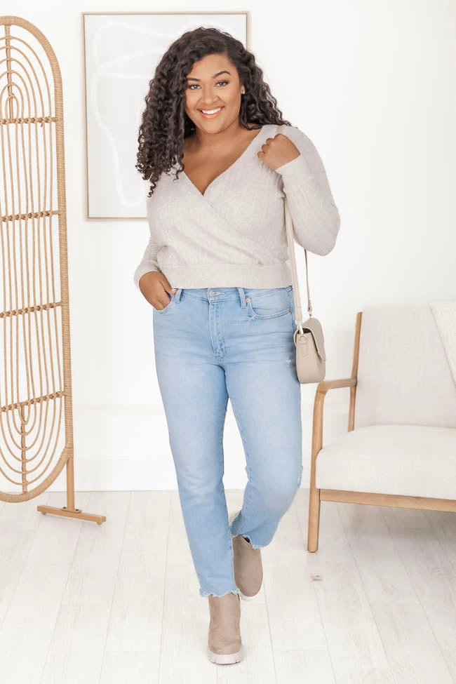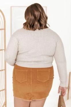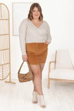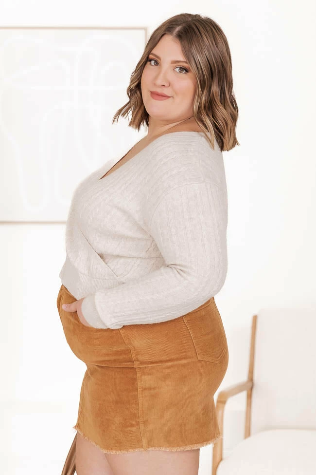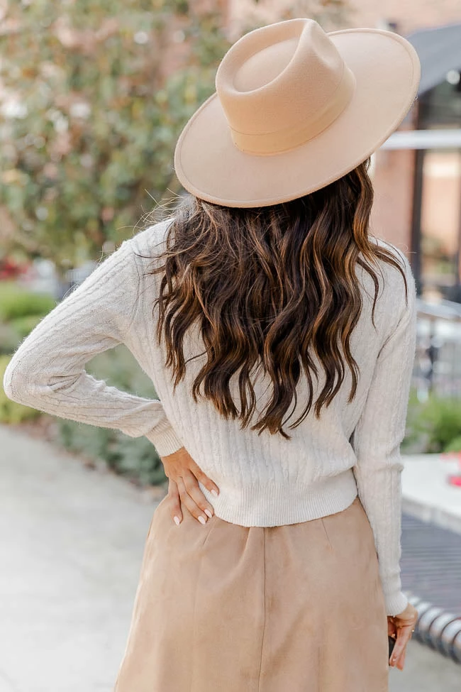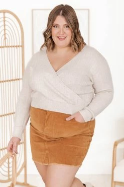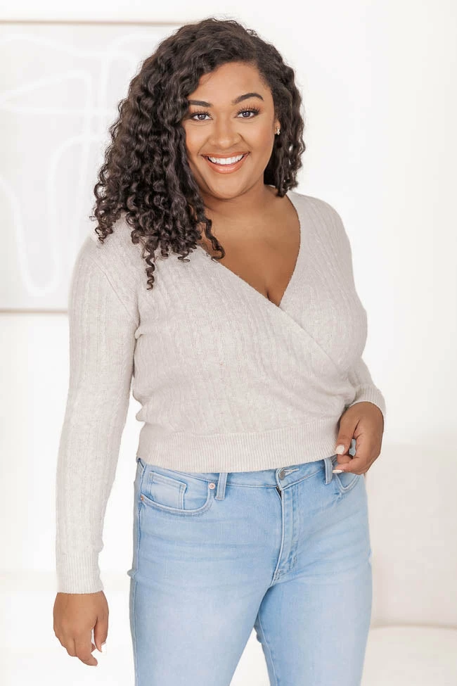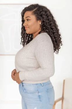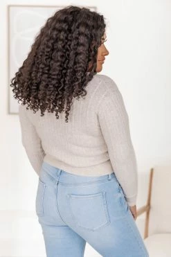 - Cable knit fabric has stretch, relaxed bust