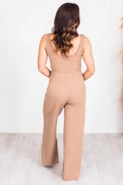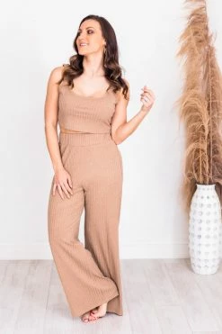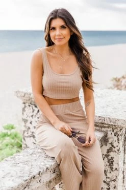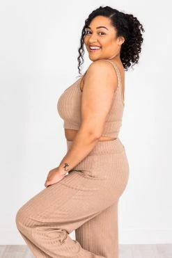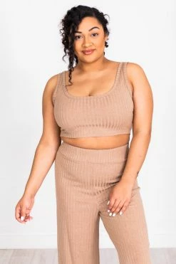 This beautiful tank is sure to be a staple in your wardrobe! Featuring a a classic taupe color and cropped style. You’ll love wearing this all day plus the ribbed material is so trendy an adds a stylish touch. Pair this with high waist jeans or the matching flare pants for a fun look!