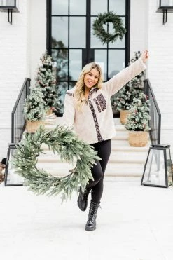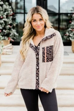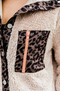 - Collared with snap button down closure, with long sleeves, leopard print lining accents, and functional pocket