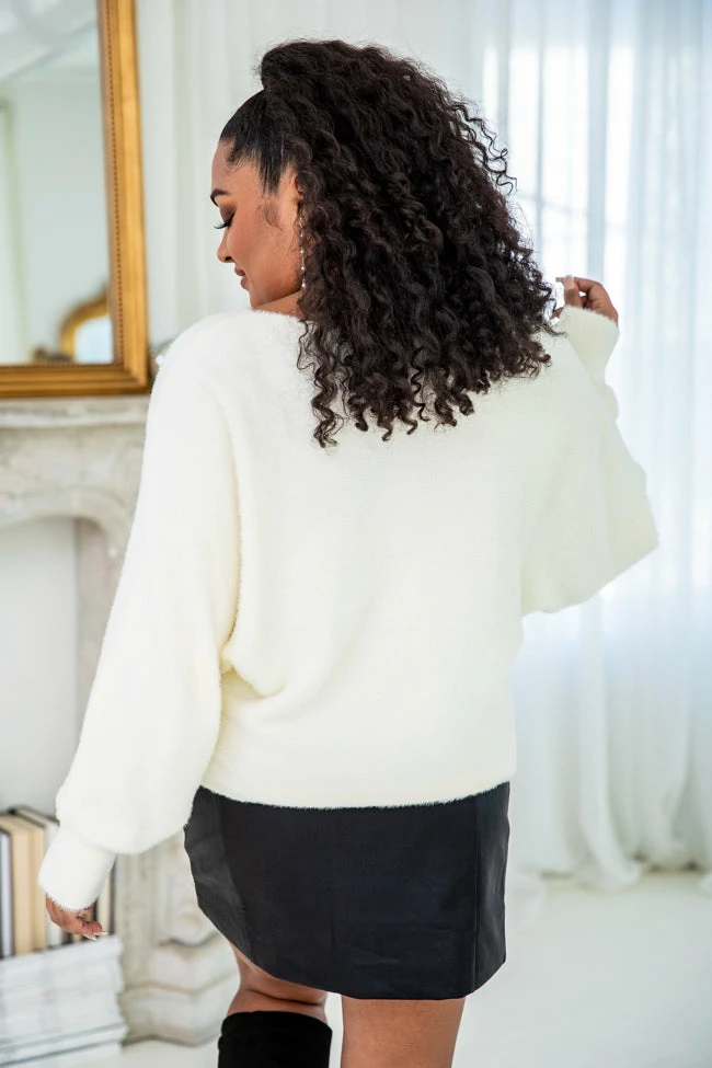 - Boat neckline with long bishop style sleeves and ribbed hem detailing