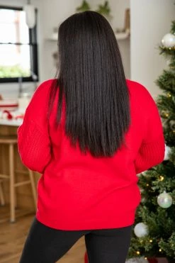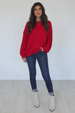 - Crew neckline with long sleeves, cable knit pattern, and ribbed hem detailing